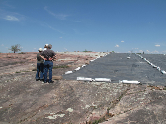 The project included a plan to naturally remove the lichen in a way that would have the smallest impact possible on the petroglyphs that might be underneath. The effort took more than five summer seasons and included covering the lichen with sun-blocking black plastic membranes to remove their source food via sunlight, and removing dead lichens with careful and repetitive mopping.