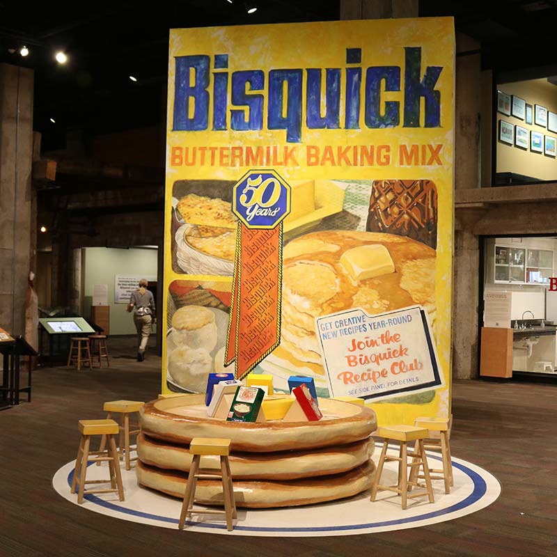 For the Promoting Mill Products exhibit, scenic painter and muralist Kim Lawler produced a 15-foot, freestanding Bisquick Box with an image of the packaging as seen in 1931 on one side and 1981 on the opposite side. Visitors are invited to step inside the box to experience signature advertising campaigns from the past and present through TV and radio commercials. Lawler also produced a 6-foot-wide stack of pancakes for a hands-on activity area where children are encouraged to design their own mill product packaging.