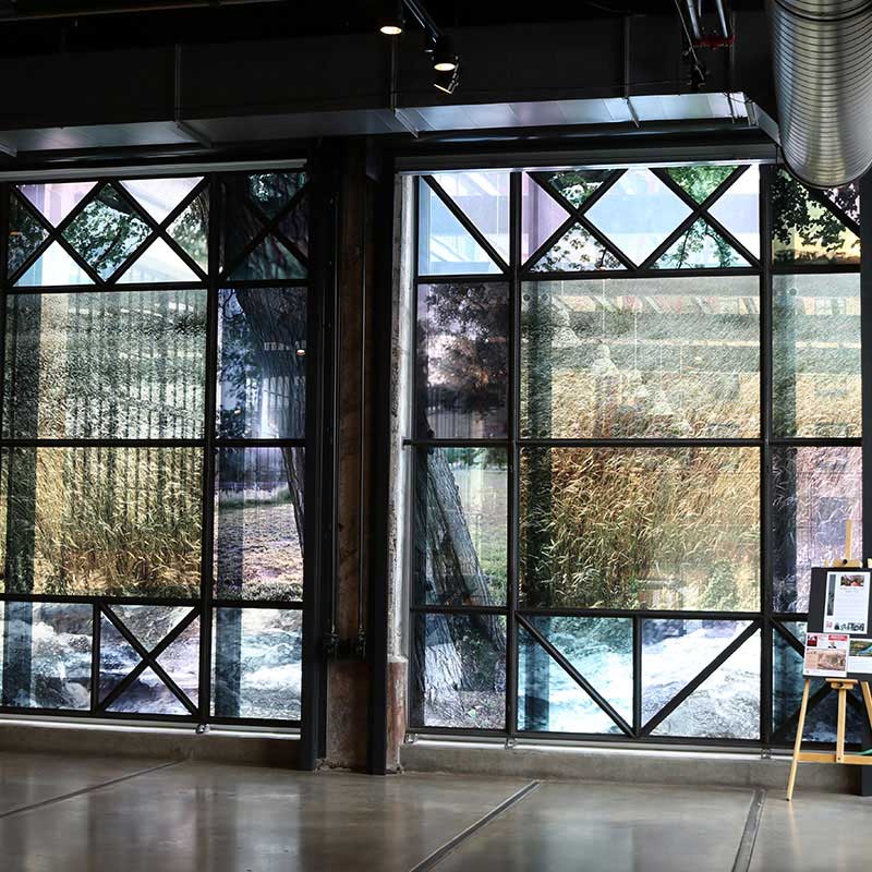 St. Anthony Falls, long considered a sacred place, is a the only waterfall on the Mississippi River. The Twin Cities were created here as the result of a great collage of forces: the spiritual regard for this location on the part of the Dakota and Ojibwe people, the power and energy of falling water, the strength and intelligence of immigrants, new possibilities of movement via the railroad, discoveries in the technology of milling, innovations in growing wheat, giant expanses of open fields, and long summer days of sunshine. This collage is made of glass, photographs, steel, and cement, and measures 14 feet tall by 25 feet wide. As you view this artwork, you stand where trains used to pass through the building. This artwork invites you to look out through images of wheat, water, tree, and sky, and from this sacred and historic location, contemplate the ever-changing present we are creating together.