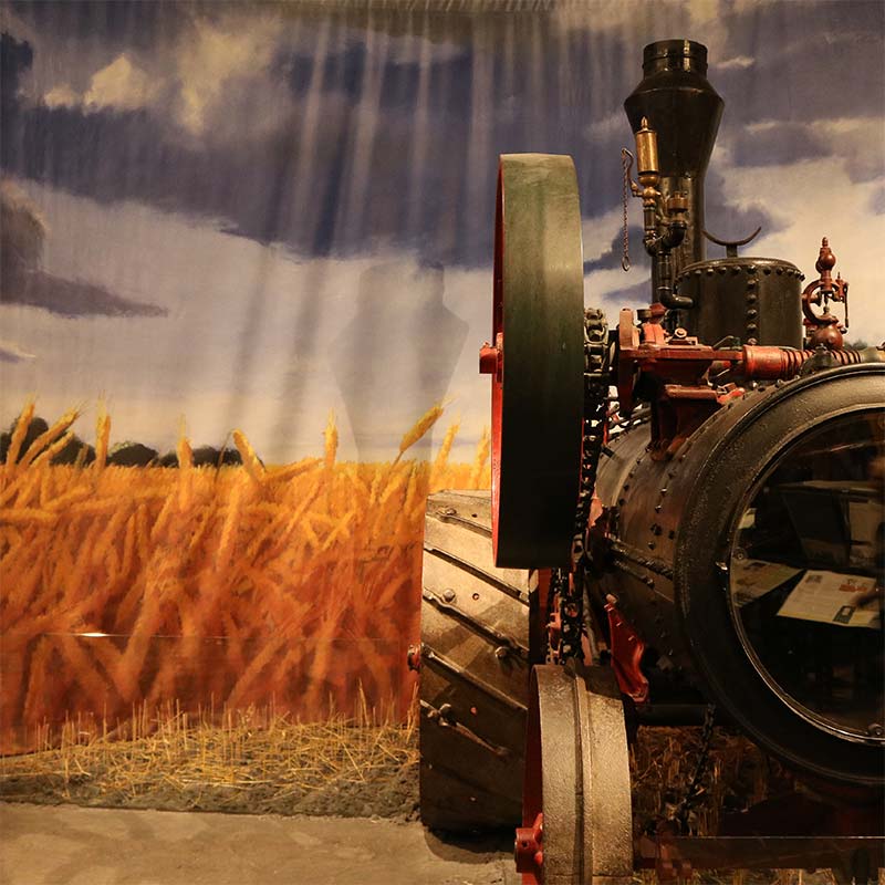 Landscape artist Tom Maakestad painted this image to serve as the backdrop for a late-19th-century traction engine, a major fixture in the Harvesting Wheat exhibit. Maakestad's original artwork was reproduced on a larger scale (10 feet by 20 feet) to create a context for the traction engine and suggest the vastness of the wheat-growing fields in Minnesota.