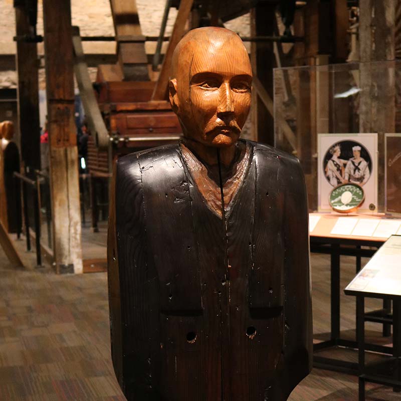 Husband-and-wife team Paul Wrench and Becky Schurmann brought characters introduced throughout Mill City Museum to life. The 13 figures were hand-carved from salvaged white pine from Humboldt Mill, a neighboring mill of the Washburn A Mill. Each sculpture has been stained and finished, and represents an individual who played a role in the flour milling story. The sculptures include William de la Barre, the Austrian engineer who designed Washburn A Mill; Jean Spielman, a labor organizer; Mary Dodge Woodward, a cook on a bonanza wheat farm; and boxcar loaders and female flour packers.