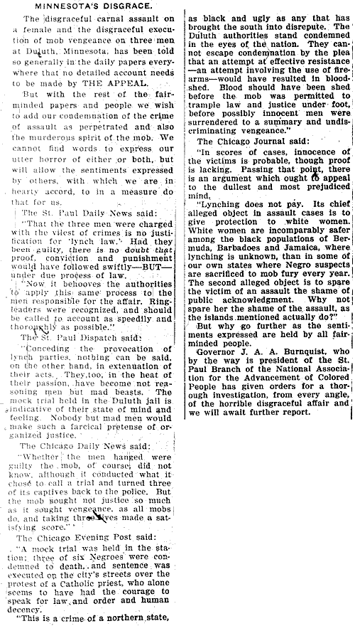 “Conceding the provocation of lynch parties, nothing can be said on the other hand in extenuation of their acts. They, too, in the heat of their passion, have become not reasoning men but mad beasts. The mock trial held in the Duluth jail is indicative of their state of mind and feeling. Nobody but mad men would make such a farcical pretense of organized justice.