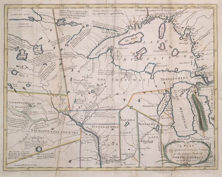 Dakota and Ojibwe Lands, ca. 1768. Jonathan Carver, from Travels through the Interior Parts of North-America in the Years 1766, 1767, and 1768, 1778. Source: James Ford Bell Library, University of Minnesota.