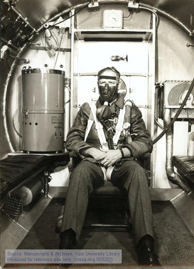 Charles A. Lindbergh in an altitude chamber prior to testing at the Mayo Medical Center in Rochester, MN, September 1942. Photo courtesy of Yale University Library.