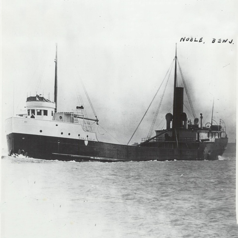 The steel bulk freight steamer was built in Michigan in 1909. The last voyage of the Benjamin Noble began ominously with the words of warning from the customs officer to Captain Eisenhardt: "I should not like to ride with you, you are over-loaded." Dangerously full with steel rails, she came west through the Great Lakes from Ohio and disappeared in a severe storm off Knife Island on April 27, 1914. All hands were lost. Ironically, the ship had been specifically designed to withstand heavy weather. In 2004, she was found 365 feet down and approximately eight miles off of Knife Island. Having hit the bottom hard, part of the vessel is buried beneath a trench it created upon impact. However, most of the ship remains intact and undisturbed, including equipment such as cargo, lifeboats and a bell.