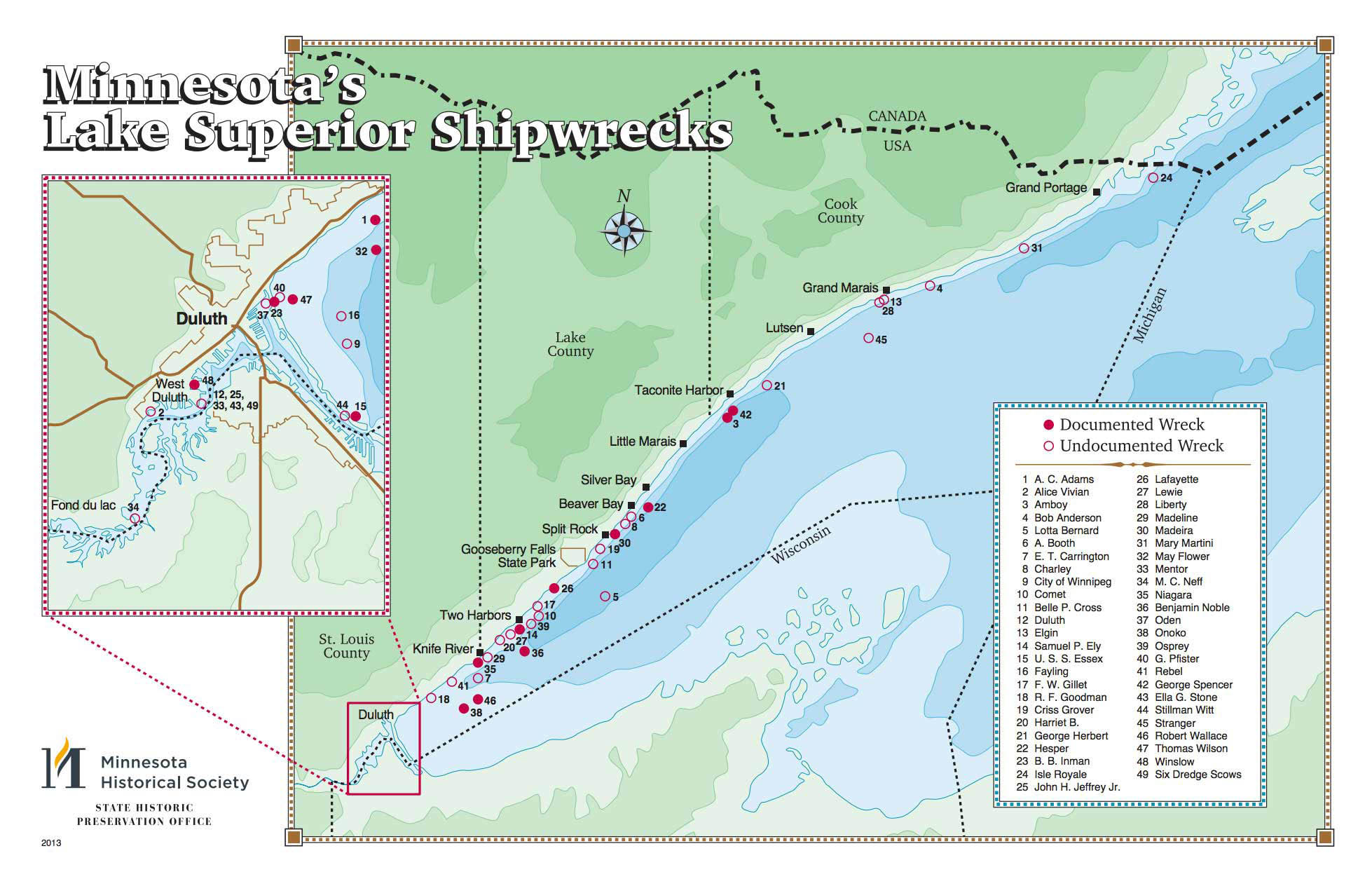 Of the estimated 10,000 shipwrecks in the Great Lakes region, only about 350 of them are located in Lake Superior. Of those, about 50 wrecks are presumed to be within Minnesota waters. Most of Minnesota's shipwreck history can be found in Lake Superior.