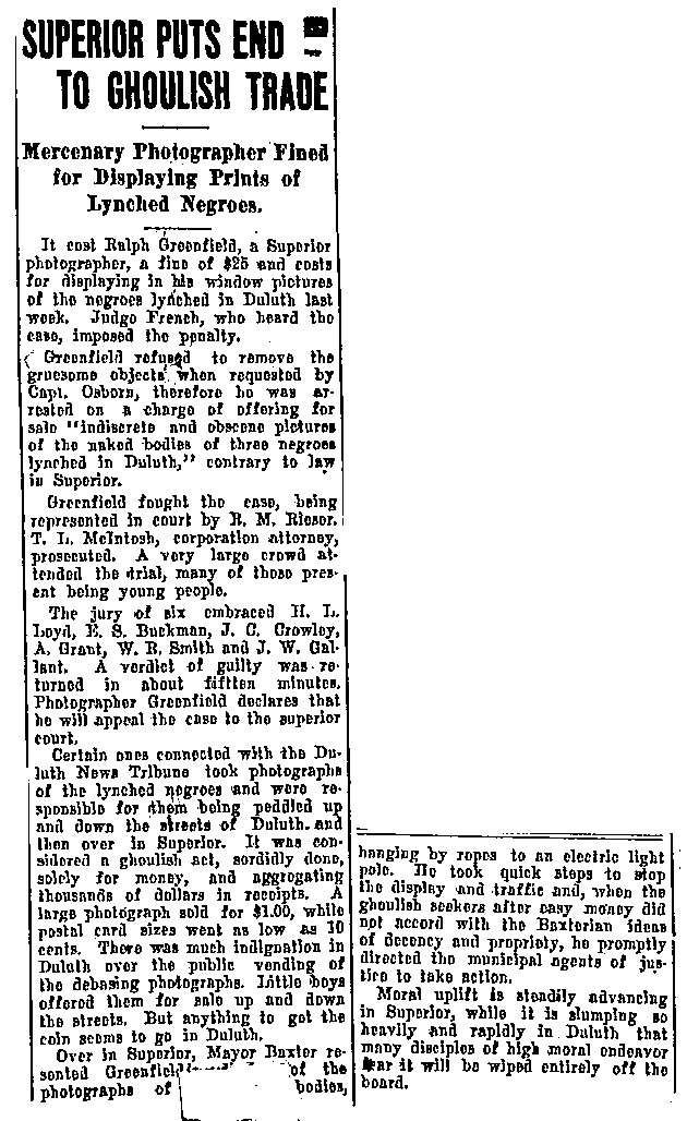 It cost Ralph Greenfield, a Superior photographer, a fine of $25 and costs for displaying in his window pictures of the negroes lynched in Duluth last week. Judge French, who hoard the case, imposed the penalty.
